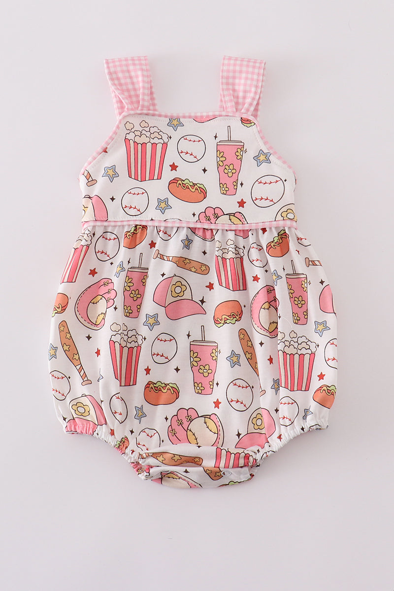 Score a home run in style with this pink baseball print gingham bubble! Made from soft cotton, this playful and unique piece will keep your little one comfortable and looking adorable all day long. Perfect for the sporty and quirky parent looking to add some fun to their baby's wardrobe.